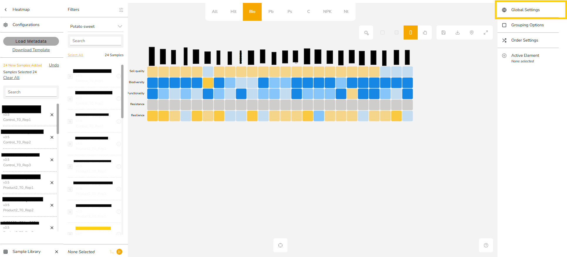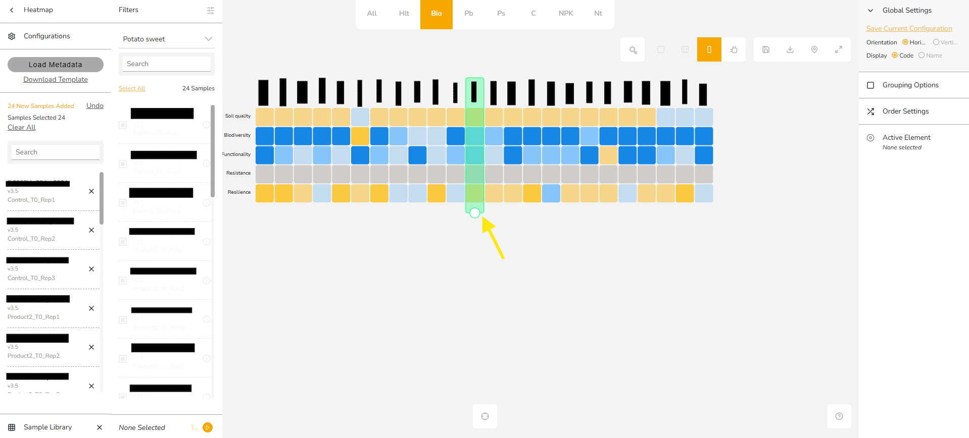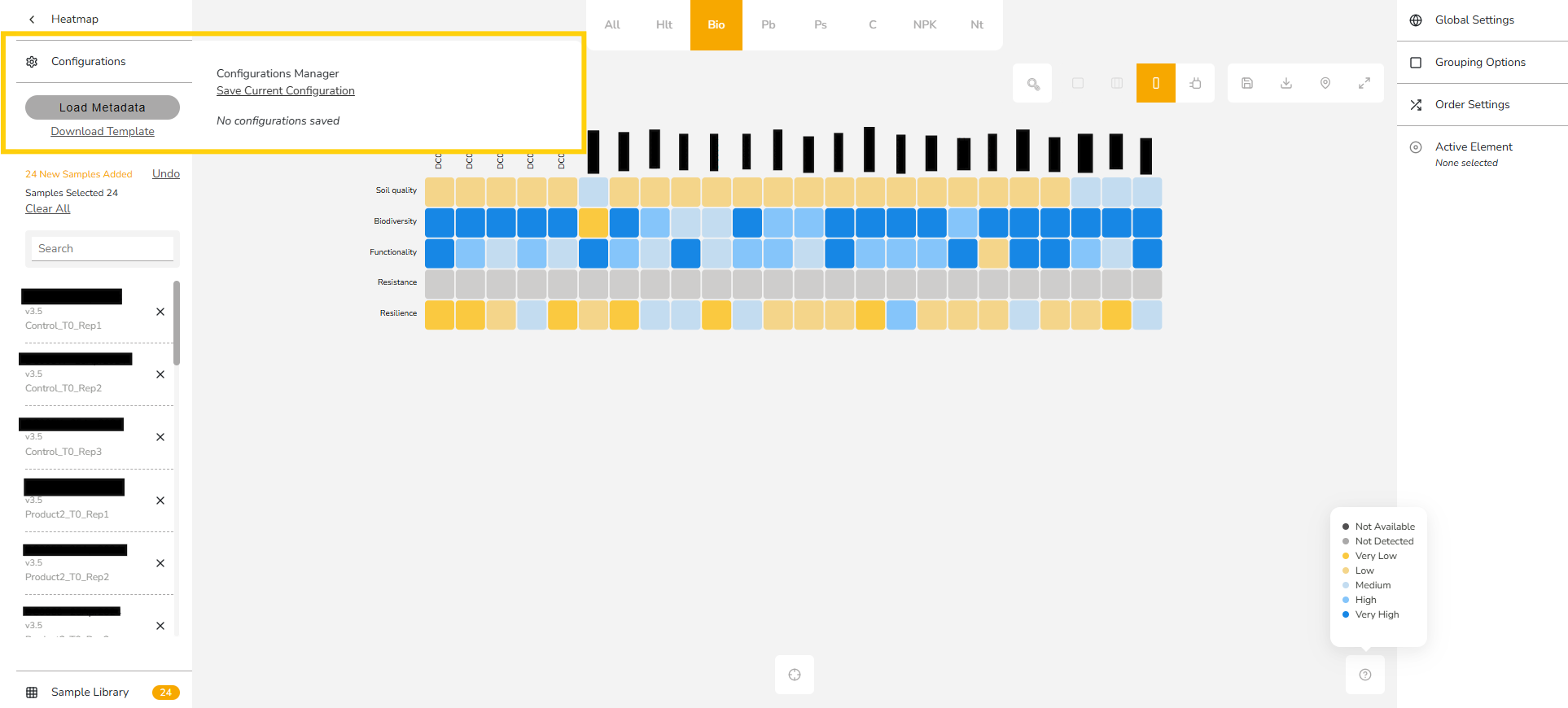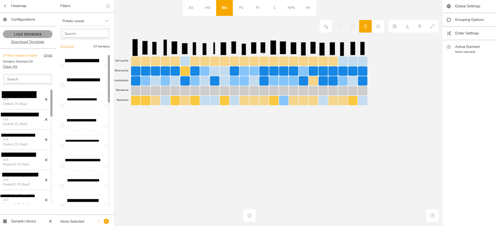 The HeatMap Tool in the BeCrop® Portal helps you visualize and compare results from multiple samples side by side. It provides a quick, color-coded overview of key soil health metrics, allowing you to identify trends, compare varieties, and make data-driven decisions at a glance.